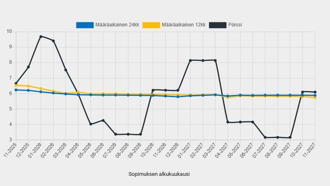 Tällä hetkellä (27.11) futuurit ennustavat tasaista hieman alle 6 snt/kWh (sis.alv.) hintaa vuonna 2026 alkaville 24kk sopimuksille. Siihen päälle tulee vielä myyjän kate, ym. eli voisi olettaa pääsevän 7 - 8snt/kWh. Sopimuksiin.