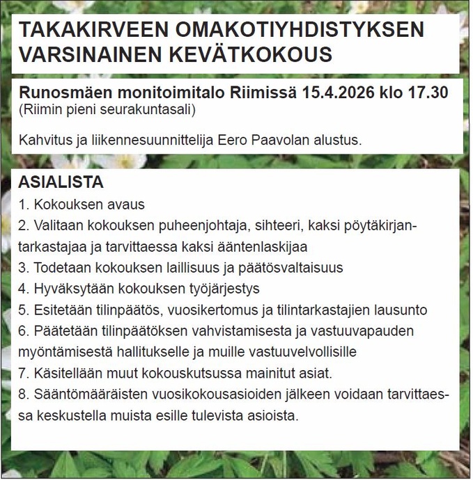 Sadesäällä jätämme monitoimikentän avajaiset väliin, joten toivotaan aurinkoista ja kuivaa vappuviikonloppua.Tiedotamme mahdollisista muutoksista facebookissa Takakirveen omakotiyhdistyksen FB ryhmässä.